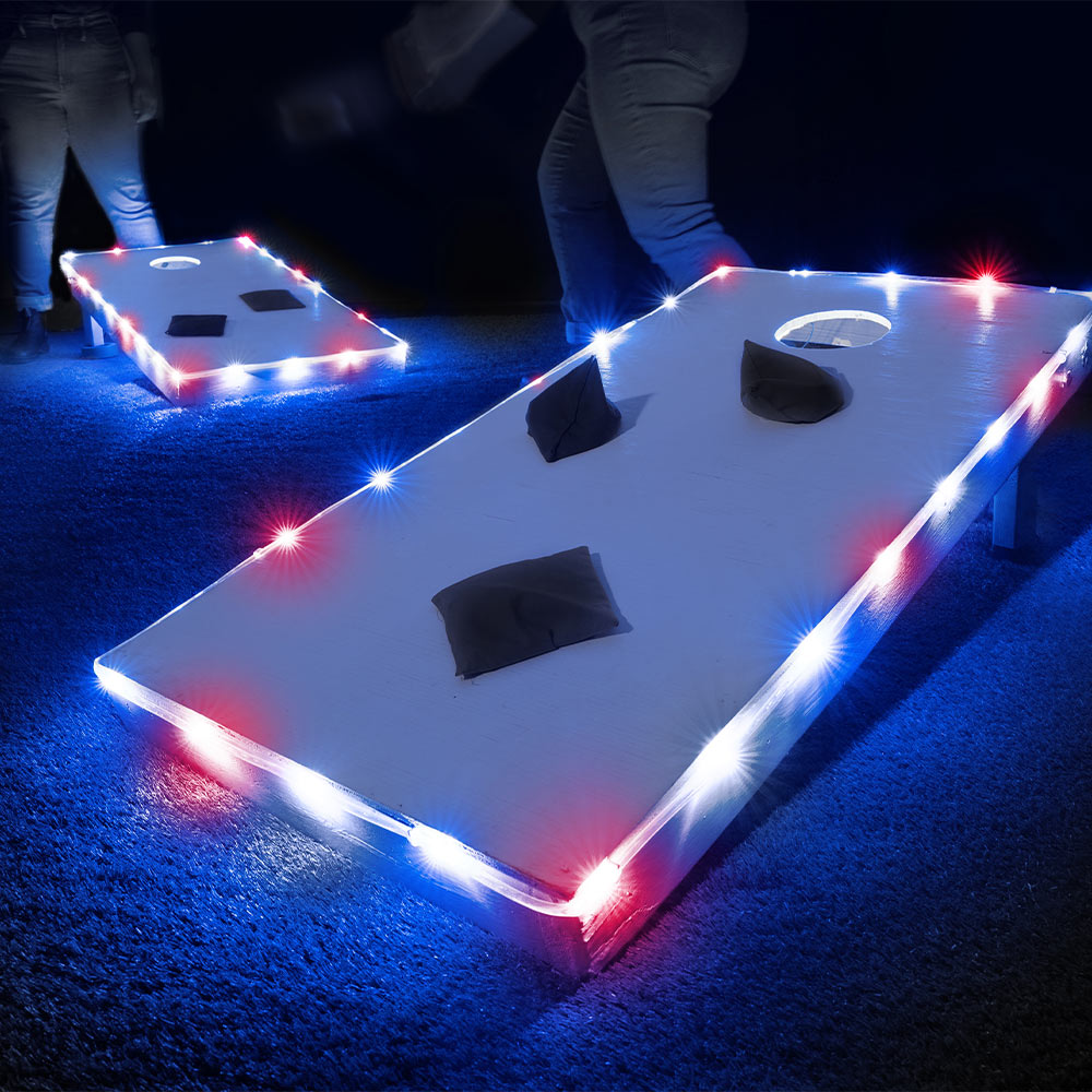 The game keeps going when the sun goes down! Our LED cornhole board lights provides everything you need to light up both boards! Each battery pack plus on/off switch easily attaches under the board. And the lights are edge-mounted so game board function stays unobstructed. Bags… Cornhole… Whatever you call it, it’s better at night!